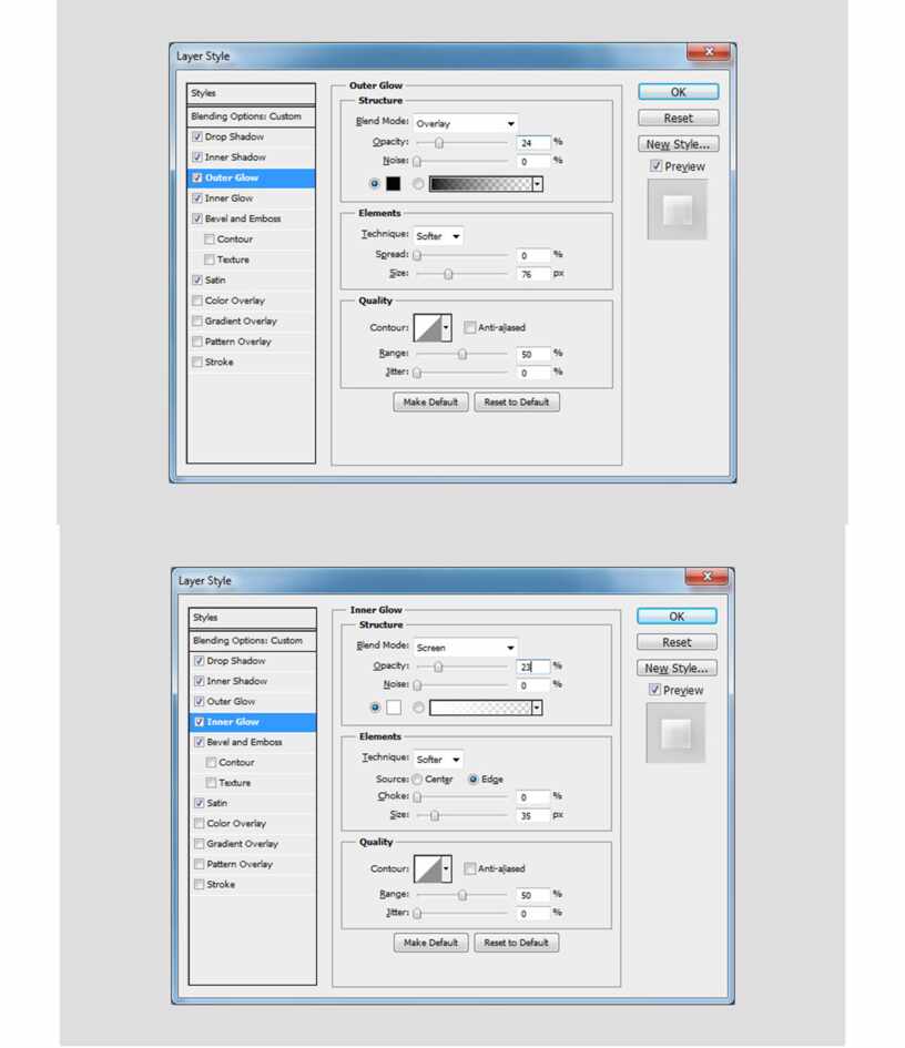 Также применяем к нему стили слоя: Drop Shadow (Тень), Inner Shadow (Внутренняя тень), Outer Glow (Внешнее свечение), Inner Glow (Внутреннее свечение), Bevel and Emboss (Фаска и тиснение) и Satin (Глянец). Для этих стилей используем цвета #ffffff и #000000.