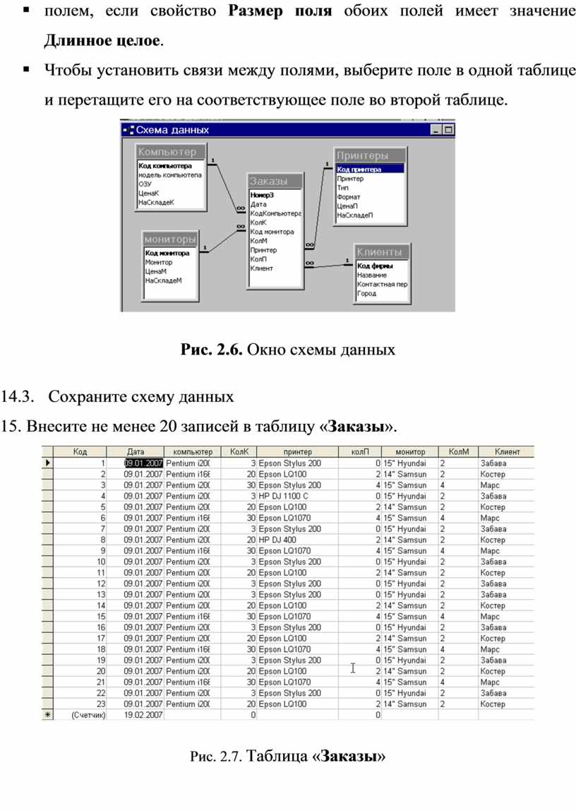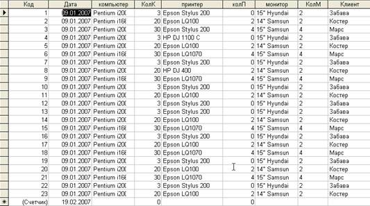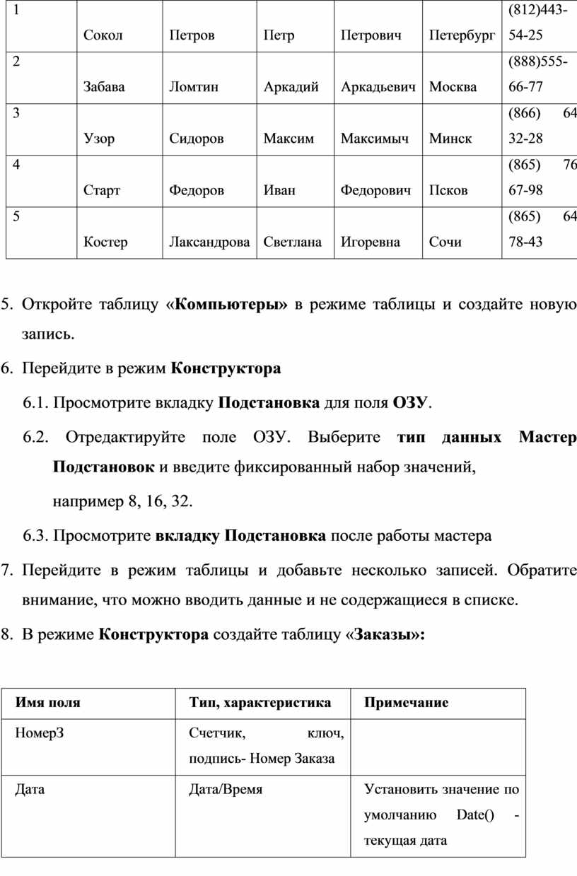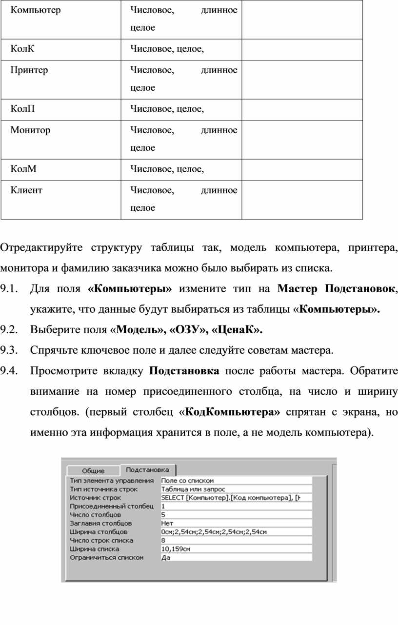9. Отредактируйте структуру таблицы так, модель компьютера, принтера, монитора и фамилию заказчика можно было выбирать из списка.