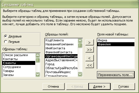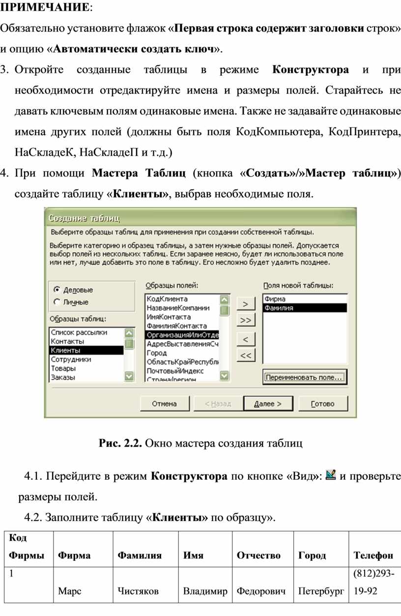 4. При помощи Мастера Таблиц (кнопка «Создать»/»Мастер таблиц») создайте таблицу «Клиенты», выбрав необходимые поля.