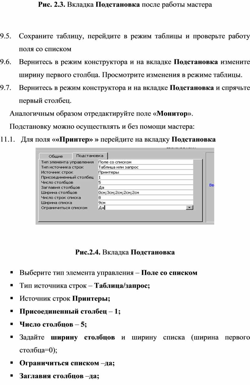 9.6. Вернитесь в режим конструктора и на вкладке Подстановка измените ширину первого столбца. Просмотрите изменения в режиме таблицы.