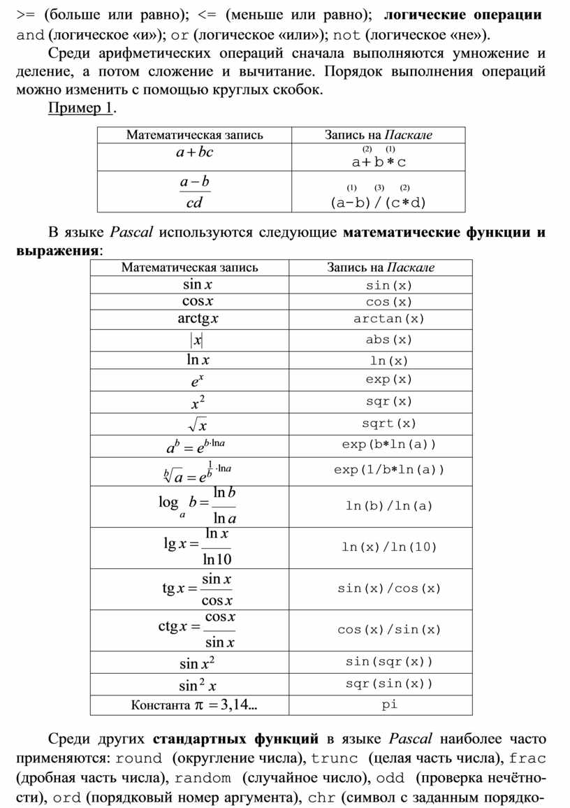 наиболее часто применяются: round (округление числа), trunc (целая часть числа), frac (дробная часть числа), random (случайное число), odd (проверка нечётно- сти), ord (порядковый номер аргумента), chr (символ с заданным порядко-