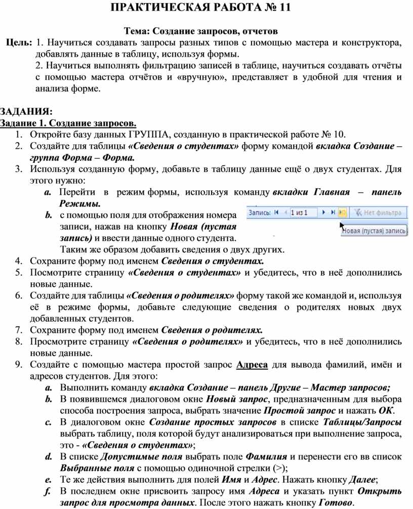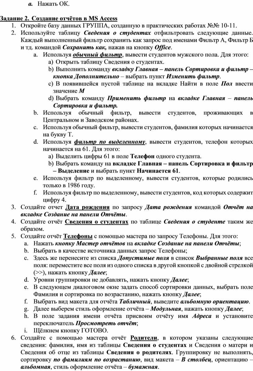 2. Научиться выполнять фильтрацию записей в таблице, научиться создавать отчёты с помощью мастера отчётов и «вручную», представляет в удобной для чтения и анализа форме.