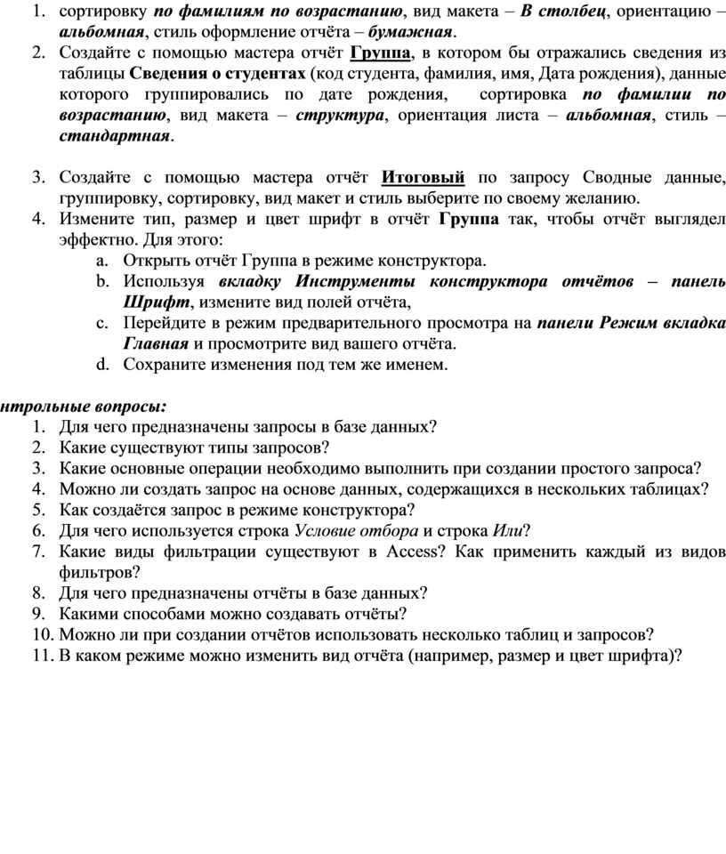 7. Создайте с помощью мастера отчёт Группа, в котором бы отражались сведения из таблицы Сведения о студентах (код студента, фамилия, имя, Дата рождения), данные которого группировались по дате рождения, сортировка по фамилии по возрастанию, вид макета – структура, ориентация листа – альбомная, стиль – стандартная.