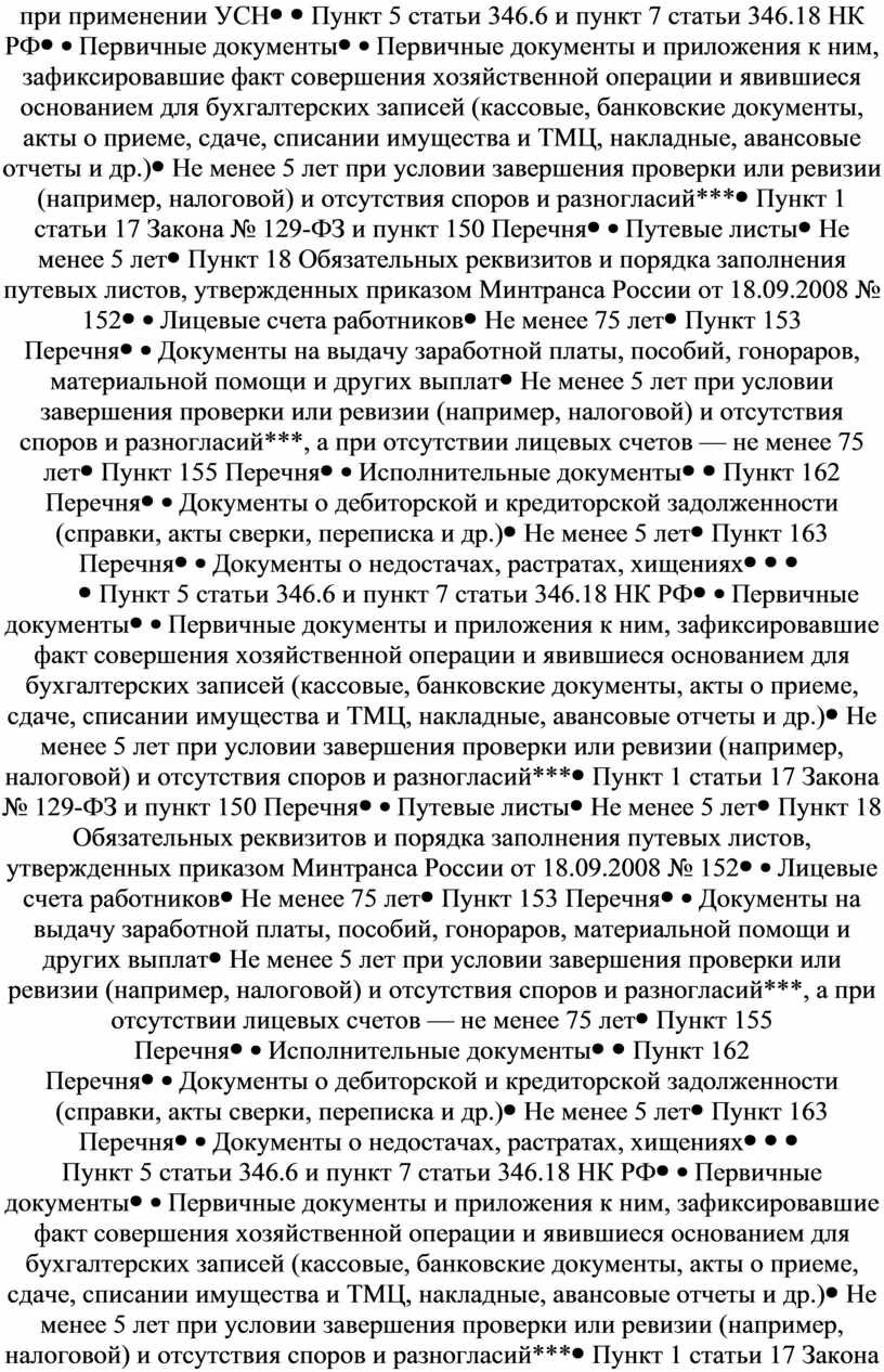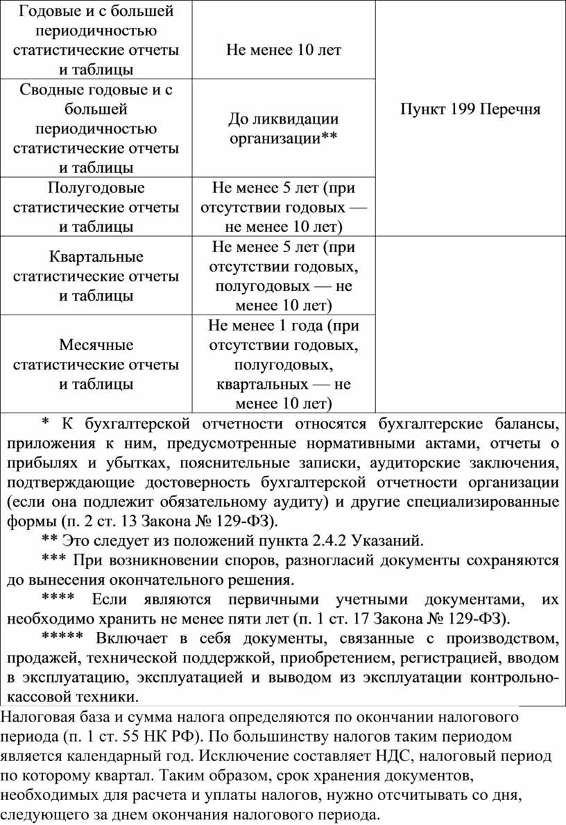 * К бухгалтерской отчетности относятся бухгалтерские балансы, приложения к ним, предусмотренные нормативными актами, отчеты о прибылях и убытках, пояснительные записки, аудиторские заключения, подтверждающие достоверность бухгалтерской отчетности организации (если она подлежит обязательному аудиту) и другие специализированные формы (п. 2 ст. 13 Закона № 129-ФЗ). ** Это следует из положений пункта 2.4.2 Указаний. *** При возникновении споров, разногласий документы сохраняются до вынесения окончательного решения. **** Если являются первичными учетными документами, их необходимо хранить не менее пяти лет (п. 1 ст. 17 Закона № 129-ФЗ). ***** Включает в себя документы, связанные с производством, продажей, технической поддержкой, приобретением, регистрацией, вводом в эксплуатацию, эксплуатацией и выводом из эксплуатации контрольно-кассовой техники. |