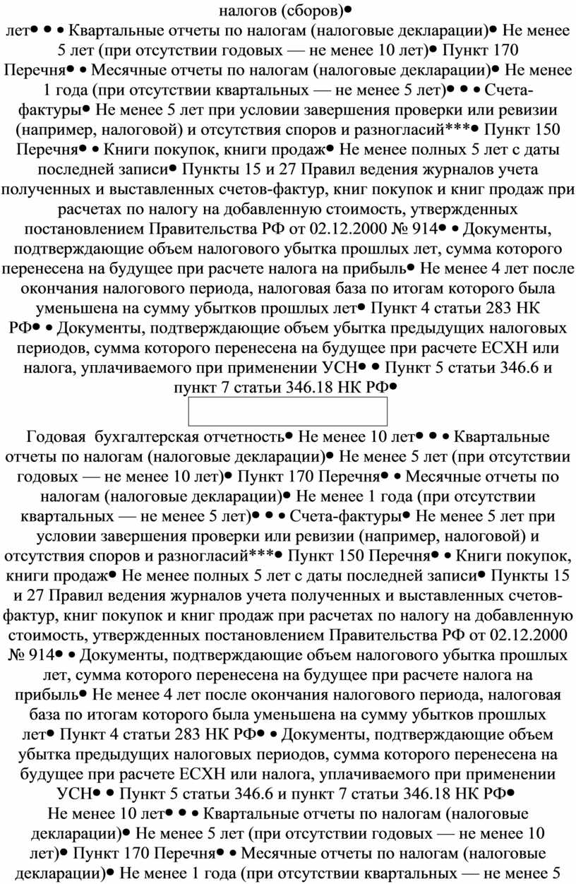 Налоговая база и сумма налога определяются по окончании налогового периода (п. 1 ст. 55 НК РФ). По большинству налогов таким периодом является календарный год. Исключение составляет НДС, налоговый период по которому квартал. Таким образом, срок хранения документов, необходимых для расчета и уплаты налогов, нужно отсчитывать со дня, следующего за днем окончания налогового периода.