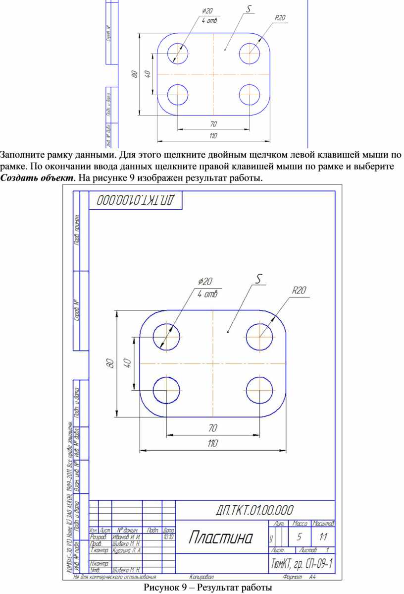 Заполните рамку данными. Для этого щелкните двойным щелчком левой клавишей мыши по рамке. По окончании ввода данных щелкните правой клавишей мыши по рамке и выберите Создать объект. На рисунке 9 изображен результат работы.
