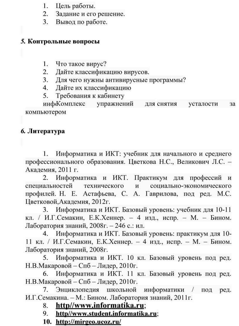 5. Информатика и ИКТ. 10 кл. Базовый уровень под ред. Н.В.Макаровой – Спб – Лидер, 2010г.
