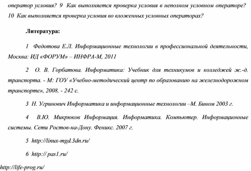2 О. В. Горбатова. Информатика: Учебник для техникумов и колледжей ж.-д. транспорта. - М: ГОУ «Учебно-методический центр по образованию на железнодорожном транспорте», 2008. - 242 с.