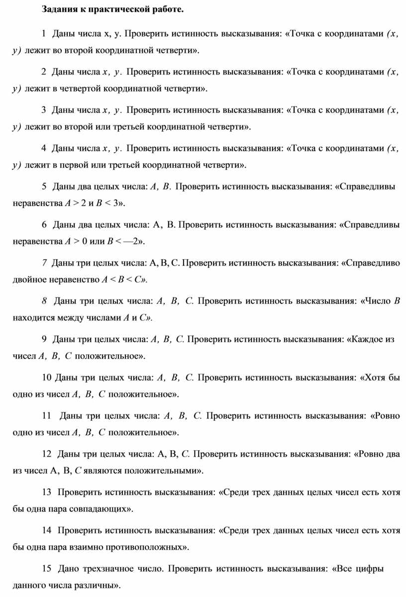3 Даны числа x , y . Проверить истинность высказывания: «Точка с координатами ( x , y ) лежит во второй или третьей координатной четверти».