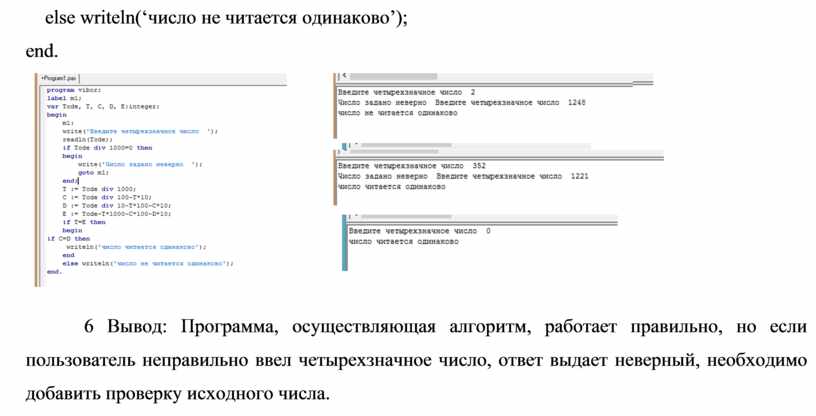 6 Вывод: Программа, осуществляющая алгоритм, работает правильно, но если пользователь неправильно ввел
