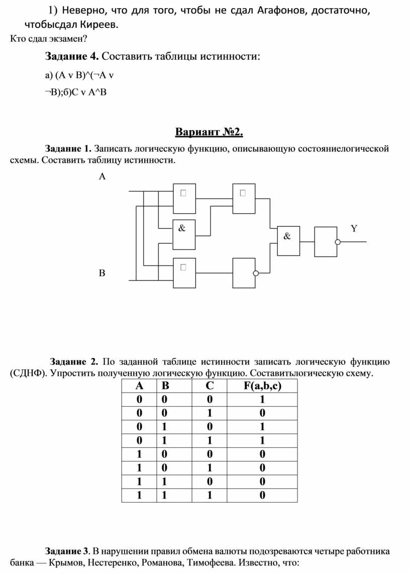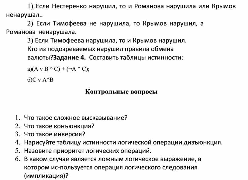 4) Если Тимофеева нарушила, то и Крымов нарушил. Кто из подозреваемых нарушил правила обмена валюты? Задание 4. Составить таблицы истинности: