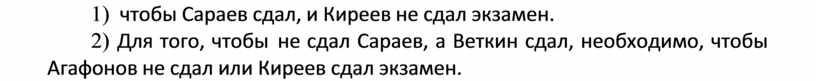 2) Для того, чтобы не сдал Сараев, а Веткин сдал, необходимо, чтобы Агафонов не сдал или Киреев сдал экзамен.