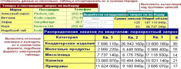 С помощью запросов можно просматривать, анализировать и изменять данные из нескольких таблиц. Они также используются в качестве источника данных для форм и отчетов.