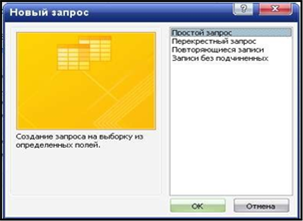 2. В открывшемся диалоговом окне Новый запрос выберите из доступных методов создания нового запроса пункт Простой запрос и щелкните ОК.