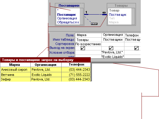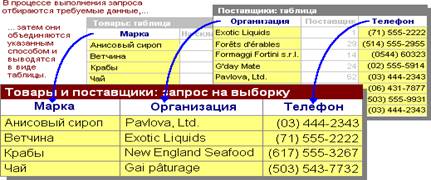 Наиболее часто используется запрос на выборку. При его выполнении данные, удовлетворяющие условиям отбора, выбираются из одной или нескольких таблиц и выводятся в определенном порядке.