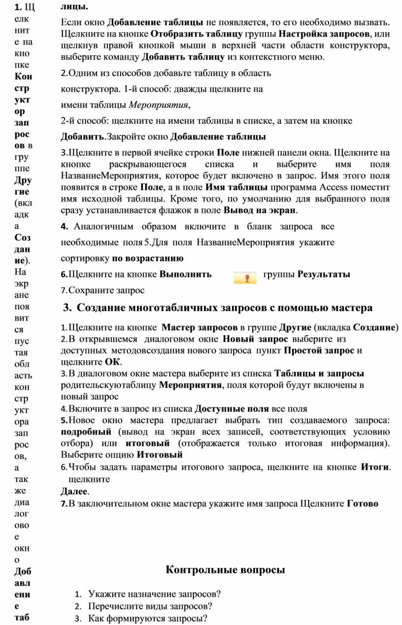 4.Аналогичным образом включите в бланк запроса все необходимые поля 5.Для поля НазваниеМероприятия укажите сортировку по возрастанию