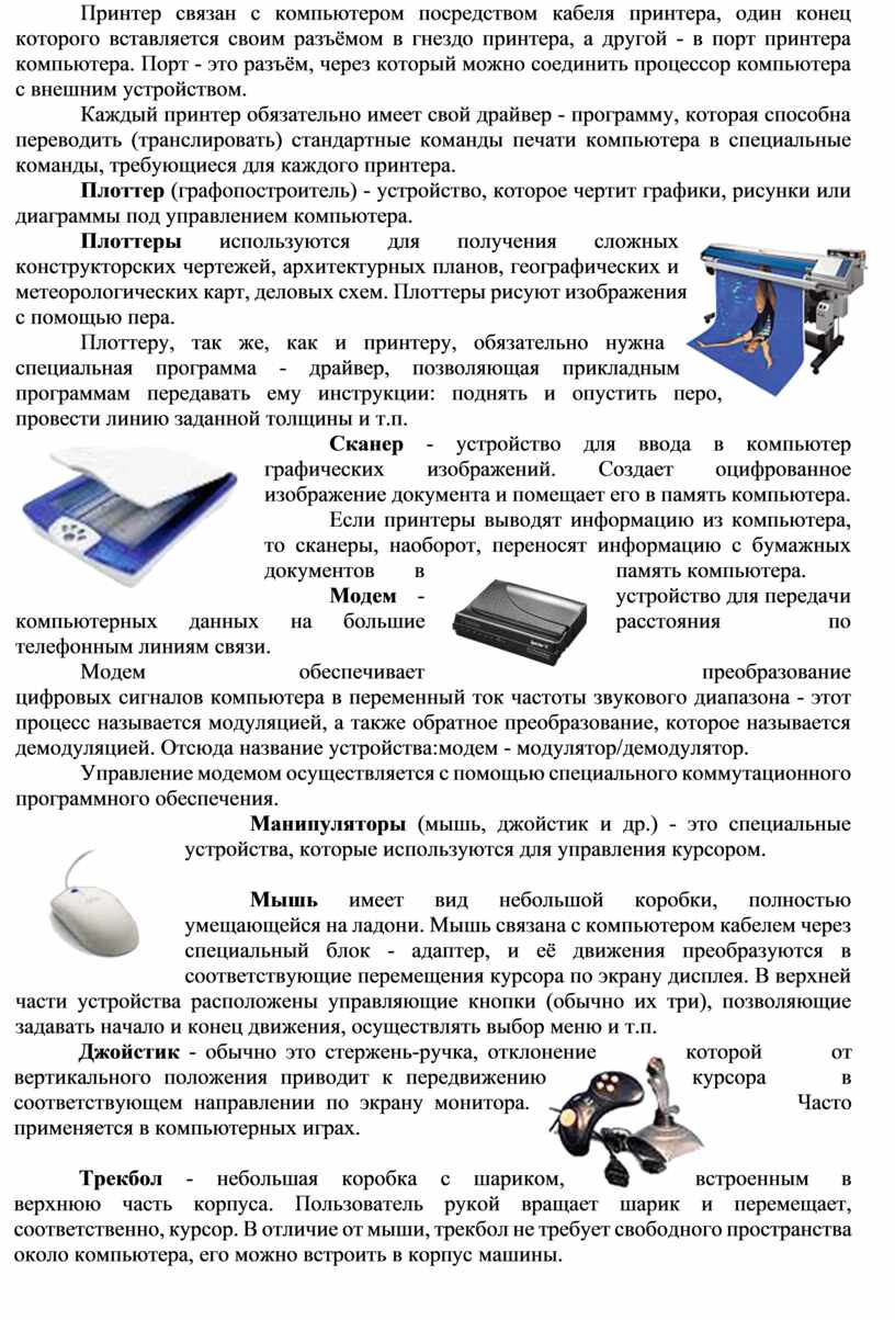 Для обмена данными между пользователем и компьютером используются внешние (периферийные) устройства. Они делятся на устройства ввода и вывода информации.