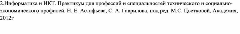 2.Информатика и ИКТ. Практикум для профессий и специальностей технического и социально-экономического профилей. Н. Е. Астафьева, С. А. Гаврилова, под ред. М.С. Цветковой, Академия, 2012г
