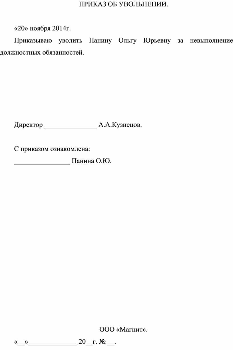 Приказываю уволить Панину Ольгу Юрьевну за невыполнение должностных обязанностей.
