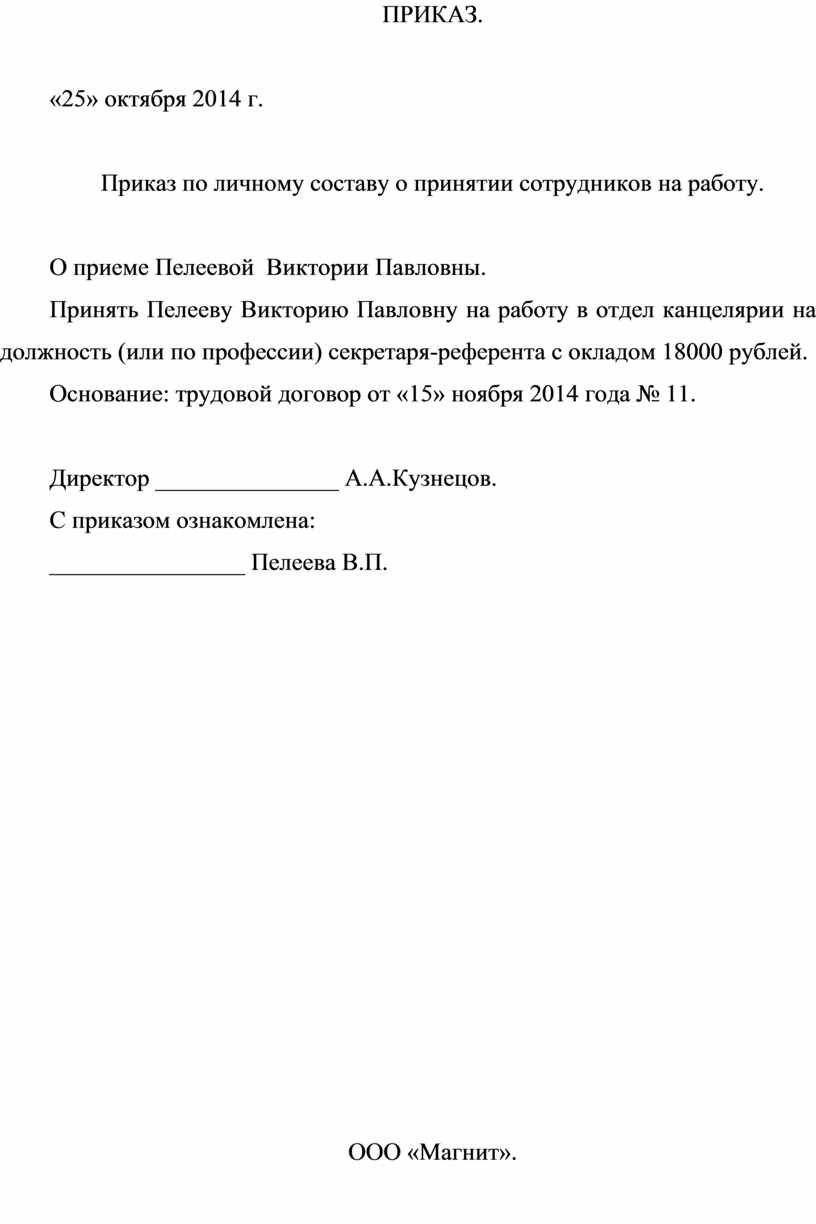 Принять Пелееву Викторию Павловну на работу в отдел канцелярии на должность (или по профессии) секретаря-референта с окладом 18000 рублей.
