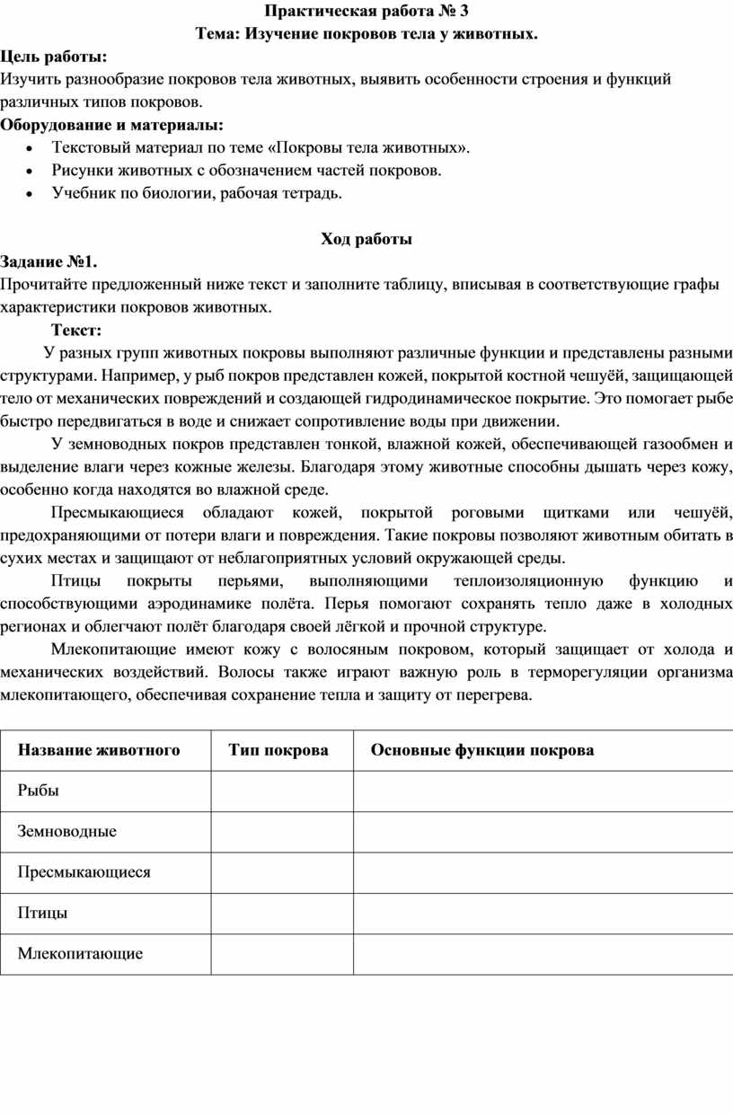 Прочитайте предложенный ниже текст и заполните таблицу, вписывая в соответствующие графы характеристики покровов животных.