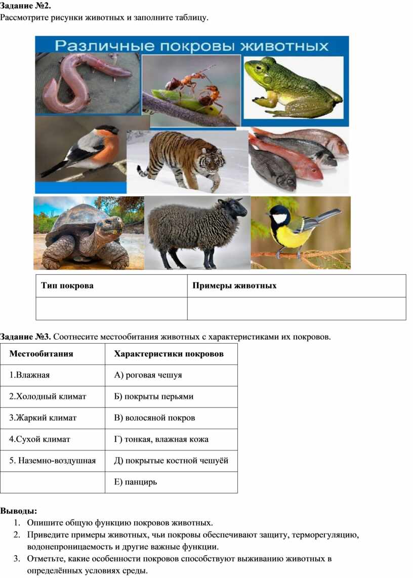 Задание №3. Соотнесите местообитания животных с характеристиками их покровов.