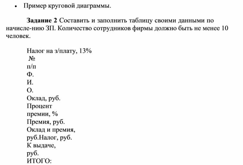 Задание 2 Составить и заполнить таблицу своими данными по начисле- нию ЗП. Количество сотрудников фирмы должно быть не менее 10 человек.