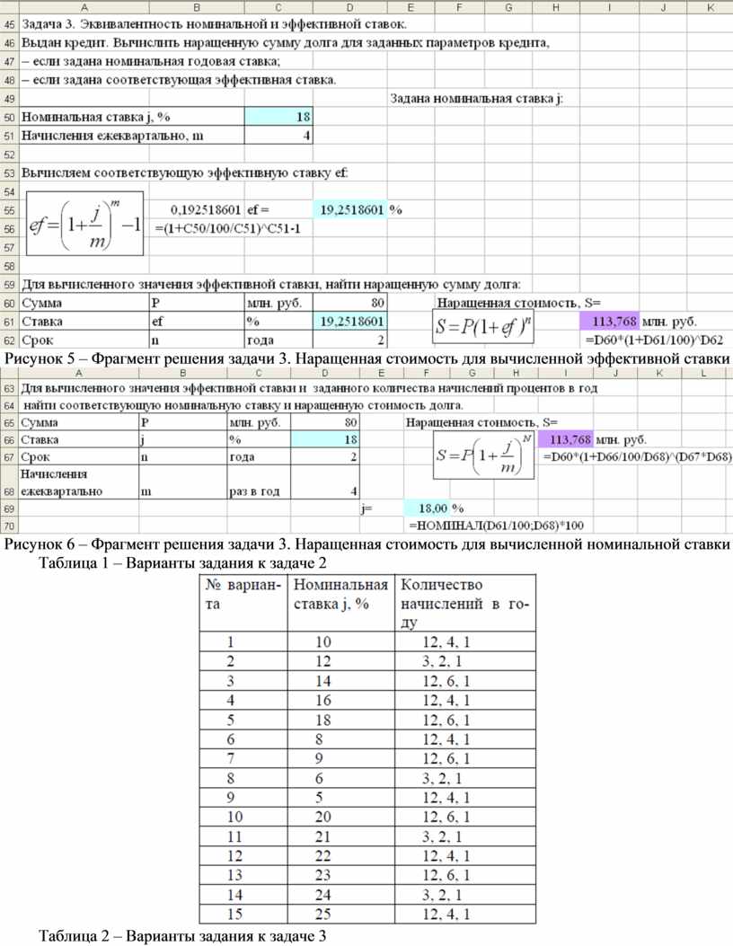 Рисунок 3 – Исходные данные и фрагмент решения задачи 2. Вычисление эффективной ставки