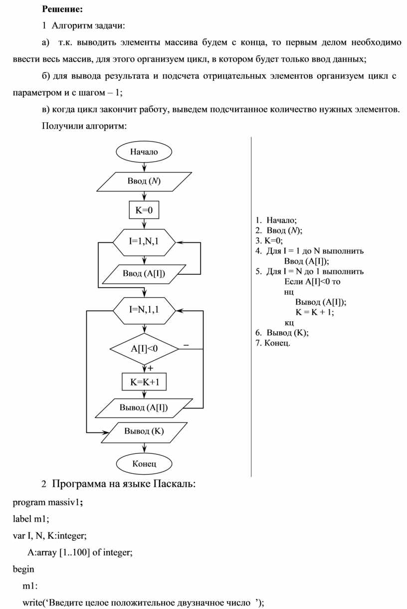 б) для вывода результата и подсчета отрицательных элементов организуем цикл с параметром и с шагом – 1;