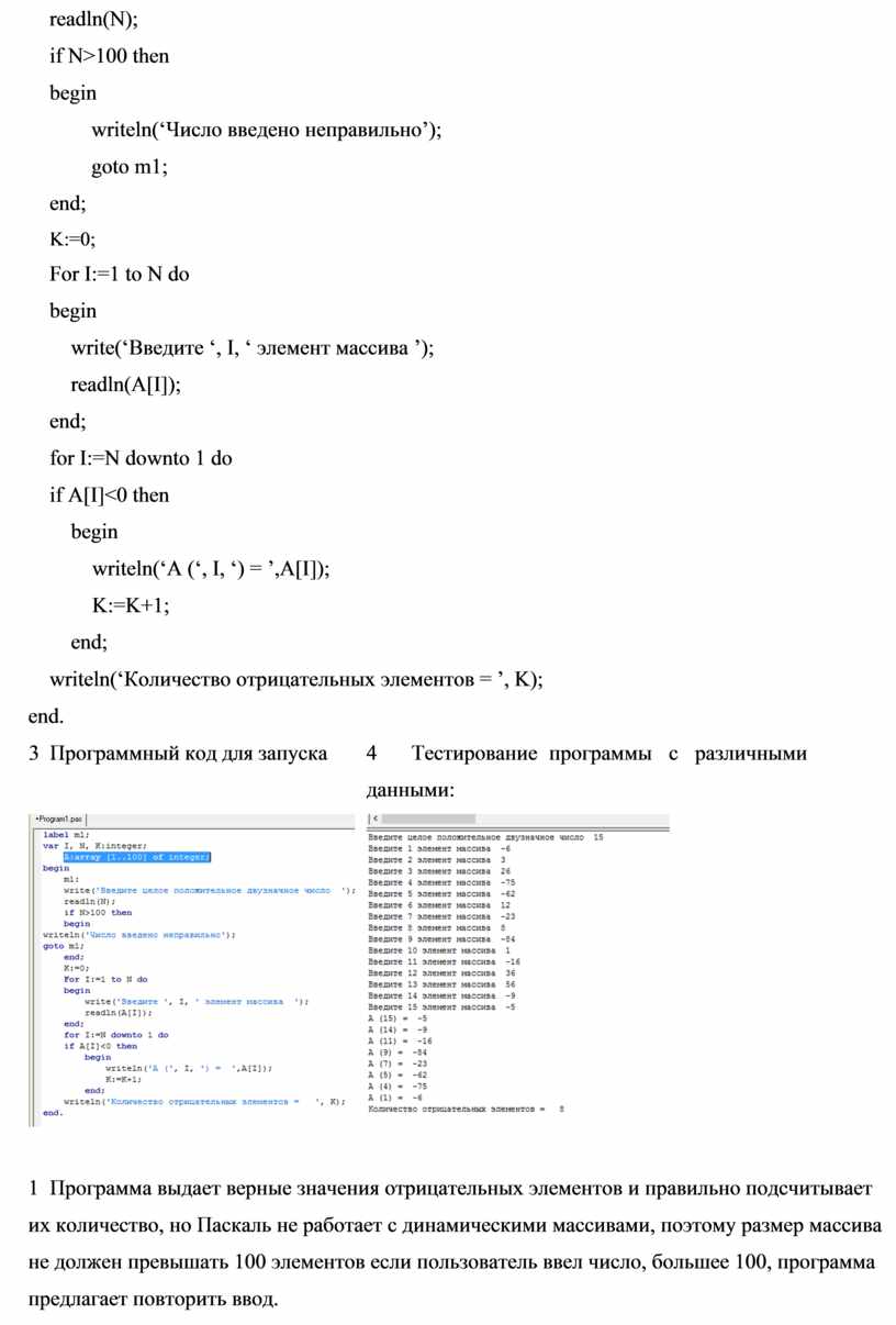 5 Программа выдает верные значения отрицательных элементов и правильно подсчитывает их количество, но Паскаль не работает с динамическими массивами, поэтому размер массива не должен превышать 100 элементов если пользователь ввел число, большее 100, программа предлагает повторить ввод.
