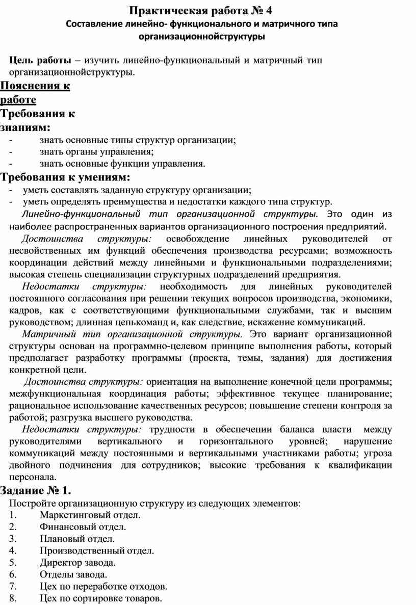 Цель работы – изучить линейно-функциональный и матричный тип организационной структуры.