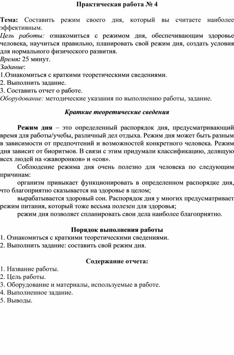 Цель работы: ознакомиться с режимом дня, обеспечивающим здоровье человека, научиться правильно, планировать свой режим дня, создать условия для нормального физического развития.