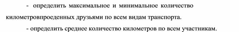 - определить максимальное и минимальное количество километров проеденных друзьями по всем видам транспорта.