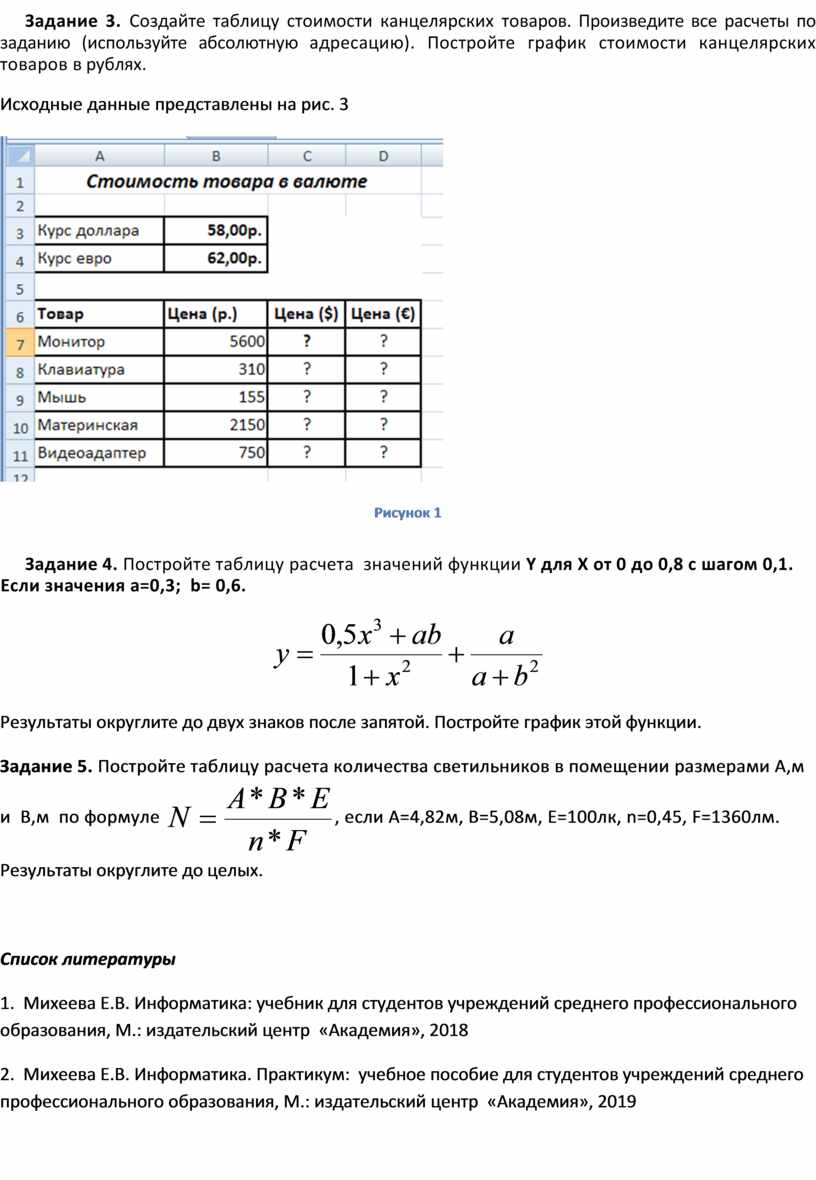 2. Михеева Е.В. Информатика. Практикум: учебное пособие для студентов учреждений среднего профессионального образования, М.: издательский центр «Академия», 2019