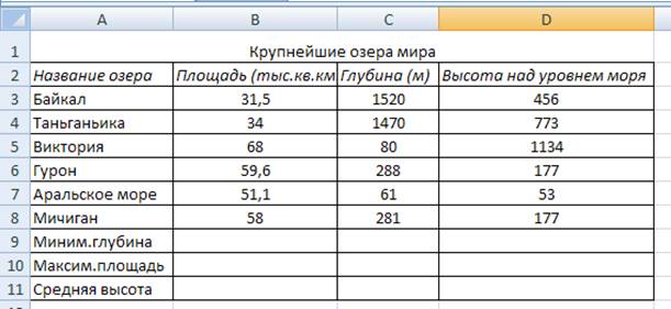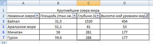 4. Для вывода сведений об озере с минимальной глубиной выполните команду Данные/фильтр щелкните по стрелке автофильтра в столбце Глубина/Числовые фильтры/настраиваемый фильтр, в окне