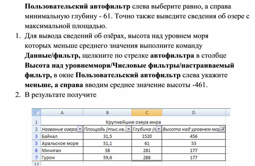 Пользовательский автофильтр слева выберите равно, а справа минимальную глубину - 61. Точно также выведите сведения об озере с максимальной площадью.