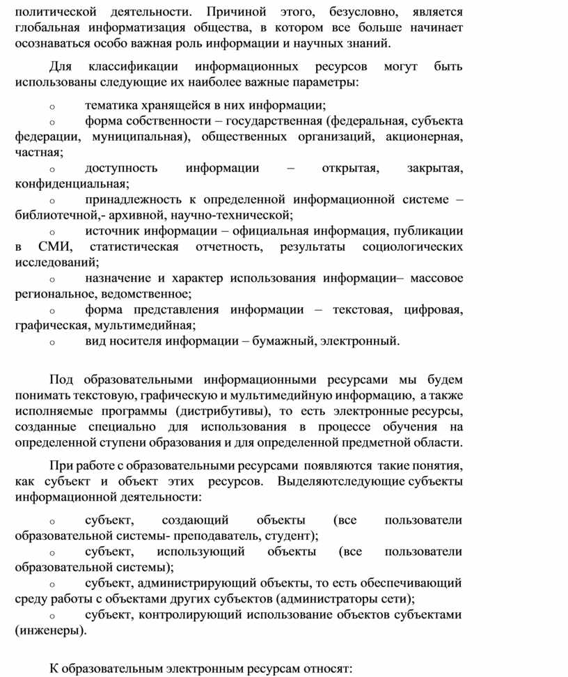 При работе с образовательными ресурсами появляются такие понятия, как субъект и объект этих ресурсов. Выделяют следующие субъекты информационной деятельности: