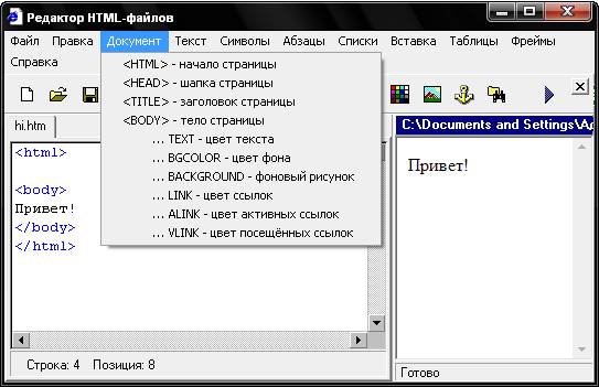 2.2. С помощью шаблонов тегов во вкладке меню «Документ» заполните основную структуру HTML-страницы: