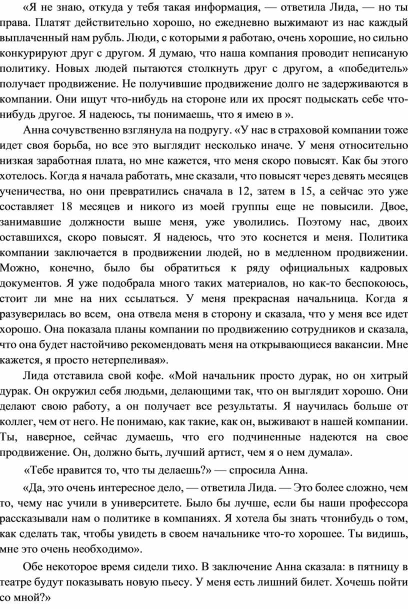Анна сочувственно взглянула на подругу. «У нас в страховой компании тоже идет своя борьба, но все это выглядит несколько иначе. У меня относительно низкая заработная плата, но мне кажется, что меня скоро повысят. Как бы этого хотелось. Когда я начала работать, мне сказали, что повысят через девять месяцев ученичества, но они превратились сначала в 12, затем в 15, а сейчас это уже составляет 18 месяцев и никого из моей группы еще не повысили. Двое, занимавшие должности выше меня, уже уволились. Поэтому нас, двоих оставшихся, скоро повысят. Я надеюсь, что это коснется и меня. Политика компании заключается в продвижении людей, но в медленном продвижении. Можно, конечно, было бы обратиться к ряду официальных кадровых документов. Я уже подобрала много таких материалов, но как-то беспокоюсь, стоит ли мне на них ссылаться. У меня прекрасная начальница. Когда я разуверилась во всем, она отвела меня в сторону и сказала, что у меня все идет хорошо. Она показала планы компании по продвижению сотрудников и сказала, что она будет настойчиво рекомендовать меня на открывающиеся вакансии. Мне кажется, я просто нетерпеливая».