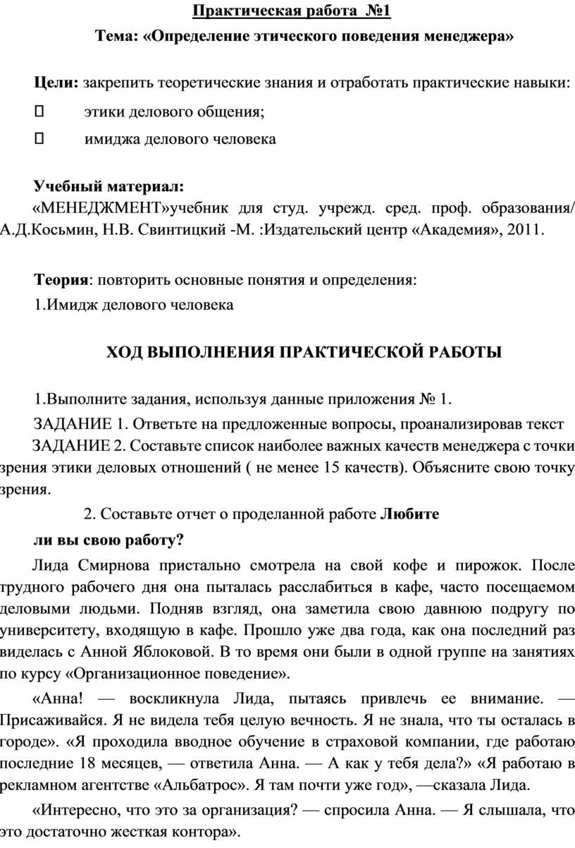 Лида Смирнова пристально смотрела на свой кофе и пирожок. После трудного рабочего дня она пыталась расслабиться в кафе, часто посещаемом деловыми людьми. Подняв взгляд, она заметила свою давнюю подругу по университету, входящую в кафе. Прошло уже два года, как она последний раз виделась с Анной Яблоковой. В то время они были в одной группе на занятиях по курсу «Организационное поведение».