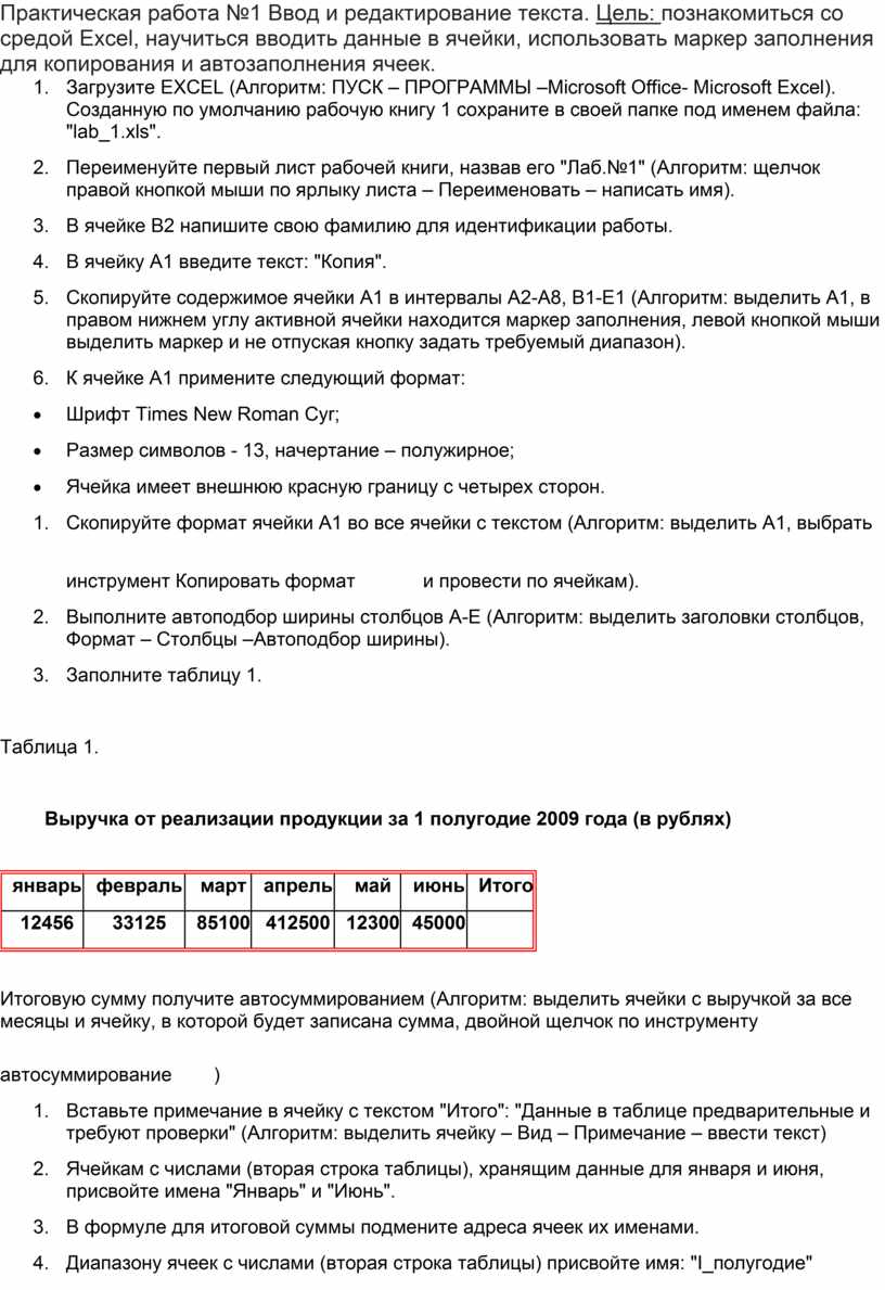 Практическая работа №1 Ввод и редактирование текста. Цель: познакомиться со средой Excel, научиться вводить данные в ячейки, использовать маркер заполнения для копирования и автозаполнения ячеек.