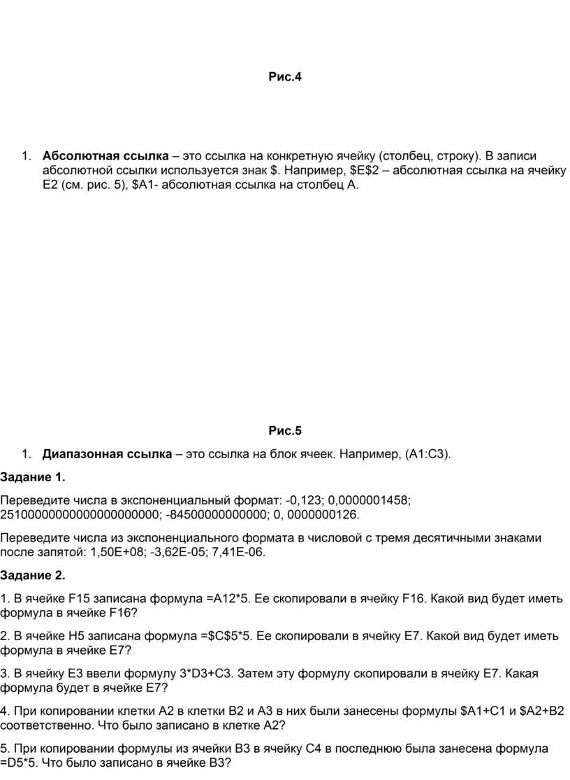 5. При копировании формулы из ячейки B3 в ячейку C4 в последнюю была занесена формула =D5*5. Что было записано в ячейке B3?