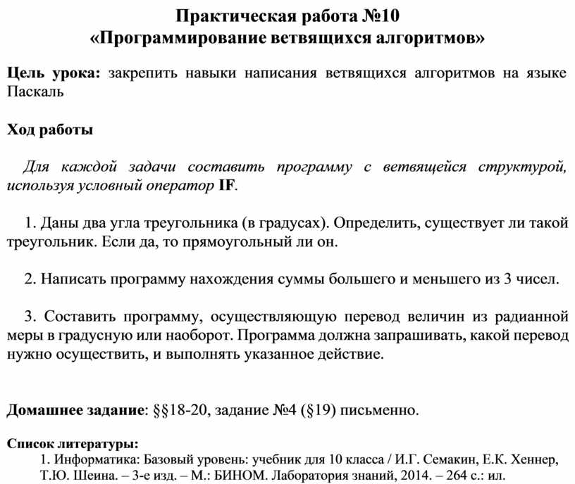 1. Информатика: Базовый уровень: учебник для 10 класса / И.Г. Семакин, Е.К. Хеннер, Т.Ю. Шеина. – 3-е изд. – М.: БИНОМ. Лаборатория знаний, 2014. – 264 с.: ил.