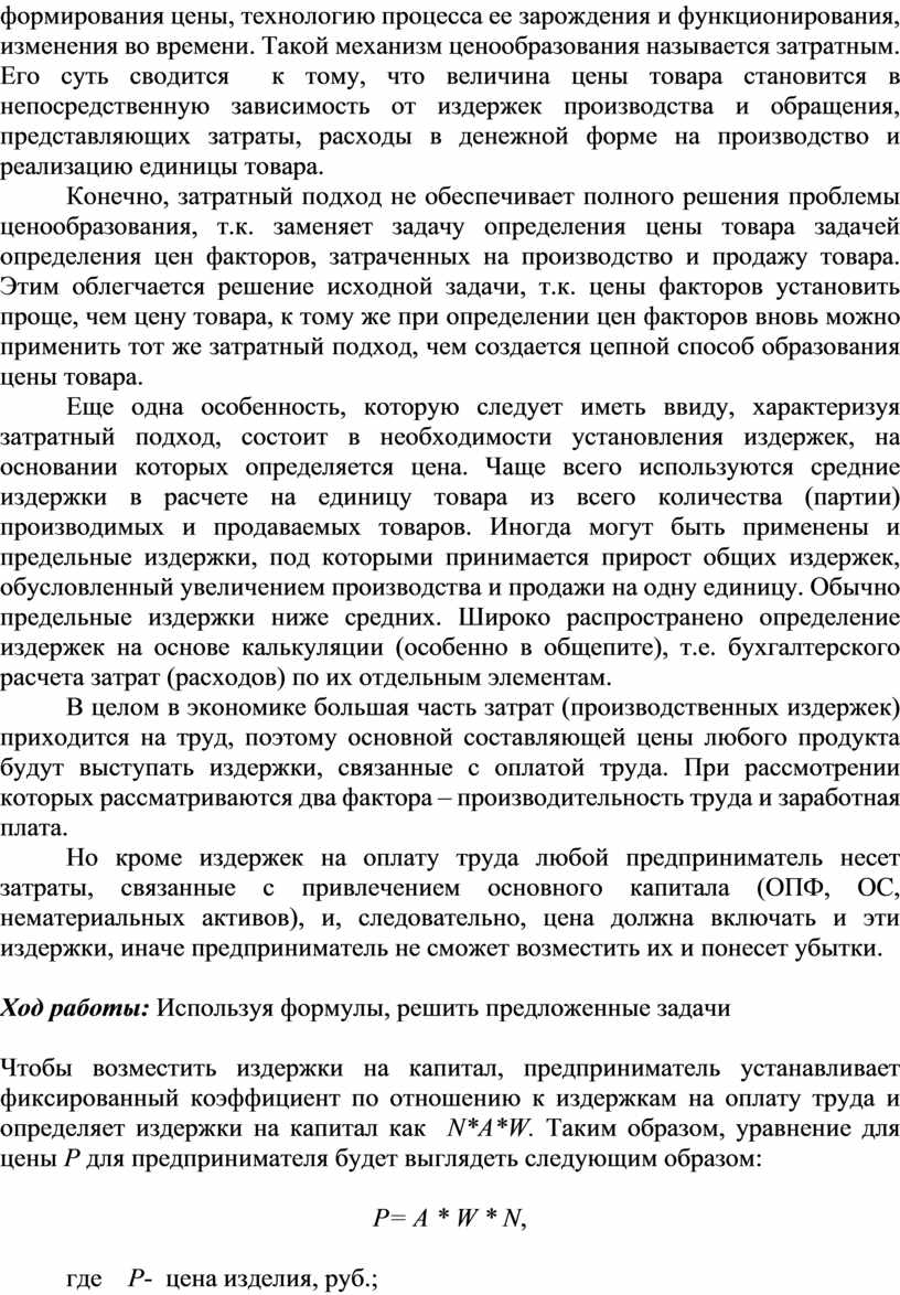 Затратный механизм ценообразования строится с учетом того обстоятельства, что производитель и продавец товара должны, продавая товар по определенной цене, не только возмещать издержки, но и получать дополнительно доход в виде прибыли. Соответственно формула цены, определяемой на основе затратного подхода, имеет следующий вид: