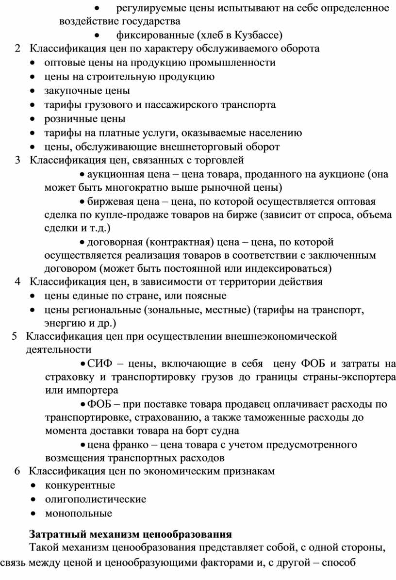 · биржевая цена – цена, по которой осуществляется оптовая сделка по купле-продаже товаров на бирже (зависит от спроса, объема сделки и т.д.)