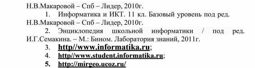 6. Информатика и ИКТ. 11 кл. Базовый уровень под ред. Н.В.Макаровой – Спб – Лидер, 2010г.