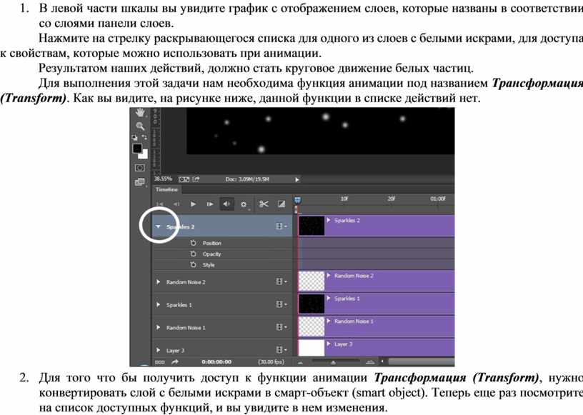 Нажмите на стрелку раскрывающегося списка для одного из слоев с белыми искрами, для доступа к свойствам, которые можно использовать при анимации.