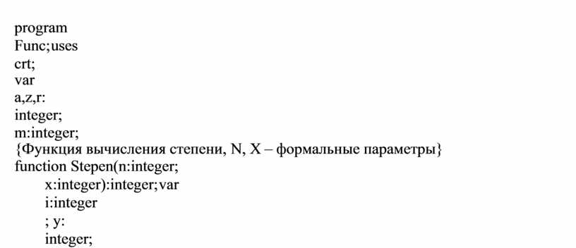 где Function - служебное слово; Name - произвольный идентификатор, определяющий имя функции. В отличии от процедур в разделе операторов тела функции обязательно должен быть хотя бы один оператор присвоения имени функции выражения или значения соответствующего типа. После работы функции результат присваивается имени функции.