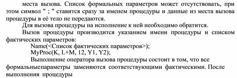 Выполнение оператора вызова процедуры состоит в том, что все формальные параметры заменяются соответствующими фактическими. После выполнения процедуры