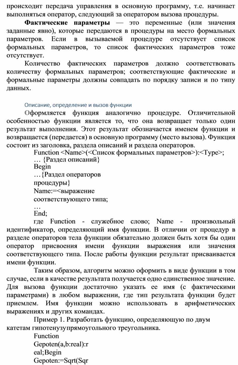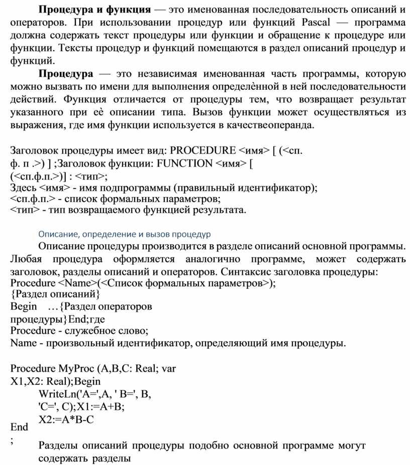 Процедура и функция — это именованная последовательность описаний и операторов. При использовании процедур или функций Pascal — программа должна содержать текст процедуры или функции и обращение к процедуре или функции. Тексты процедур и функций помещаются в раздел описаний процедур и функций.